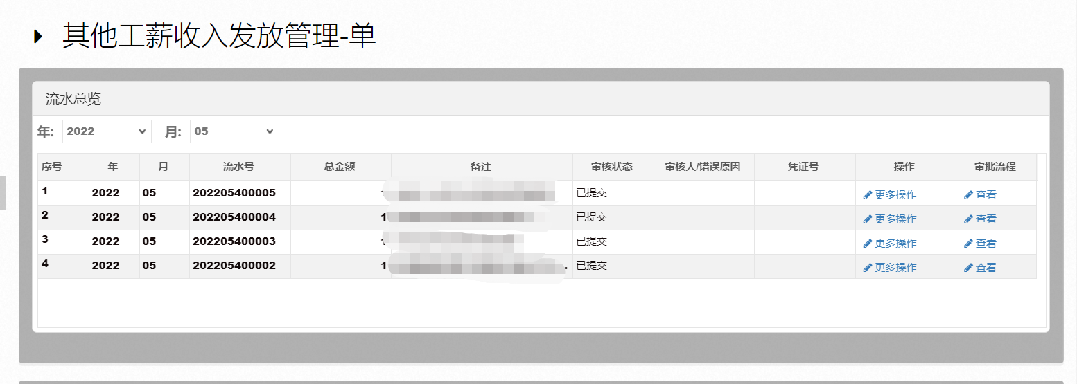 进入“其他工薪收入发放管理-单”下可以查看目前已保存/提交的申报流水信息,审核状态有“已保存”、“已提交”、“已审核”、“已退回”几个状态,对于已审核的有相关审核与凭证号信息。更多操作可以实现对,当前状态下的申报流水单的提交、复制、删除、打印等功能。如下图: