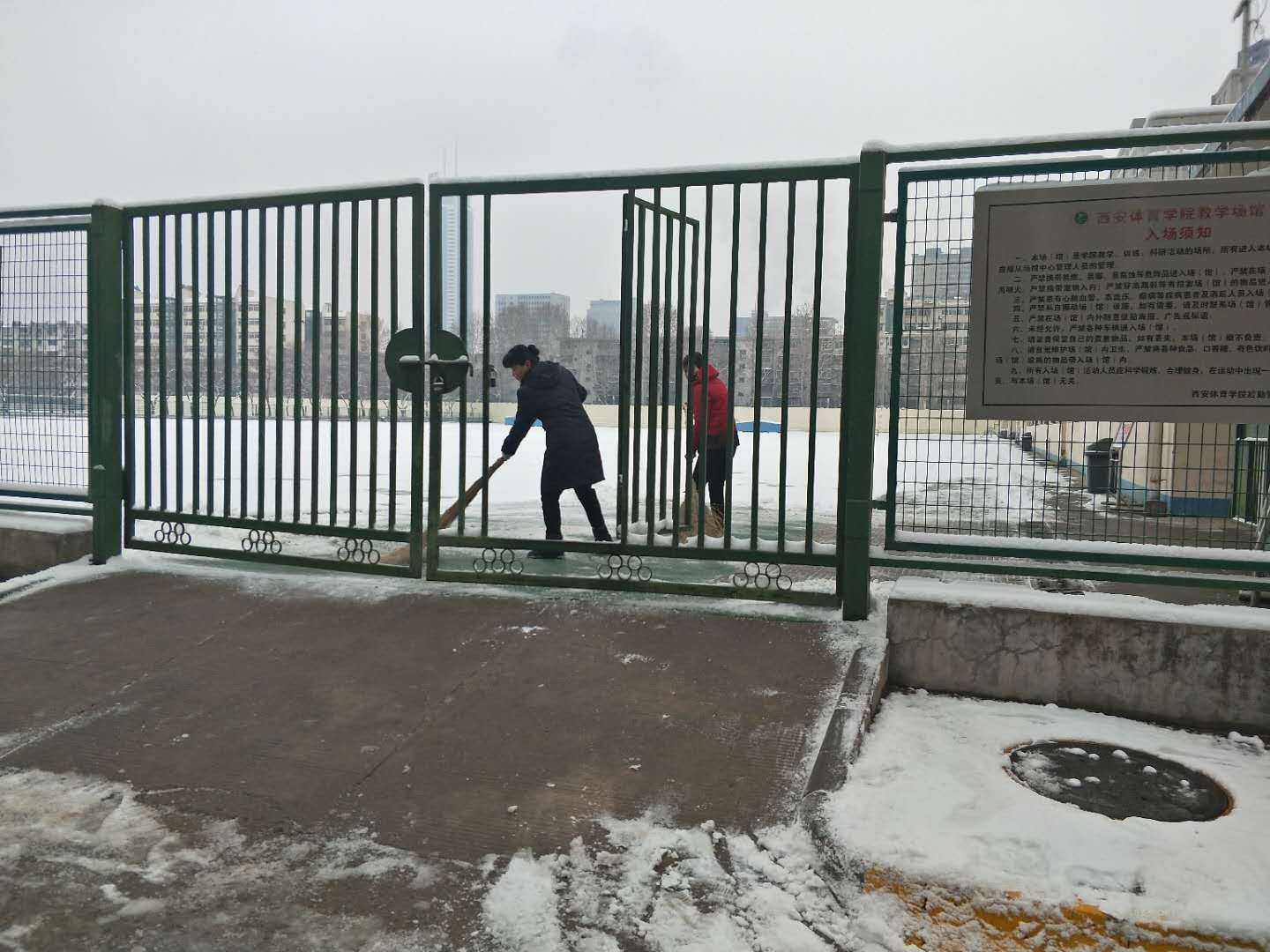 2月10日,西安迎来了新年的第一场降雪,校园顿时银装素裹,格外素美,但是这份“美丽”也给广大师生的出行带来极大不便。此前,后勤管理处(集团)保洁绿化中心已根据天气预报提前准备好扫雪工具、融雪剂、防滑毯、纸板、安全警示牌等。经过工作人员连续几个小时的奋战,将路面积雪清除干净,保障了我院师生出行安全。