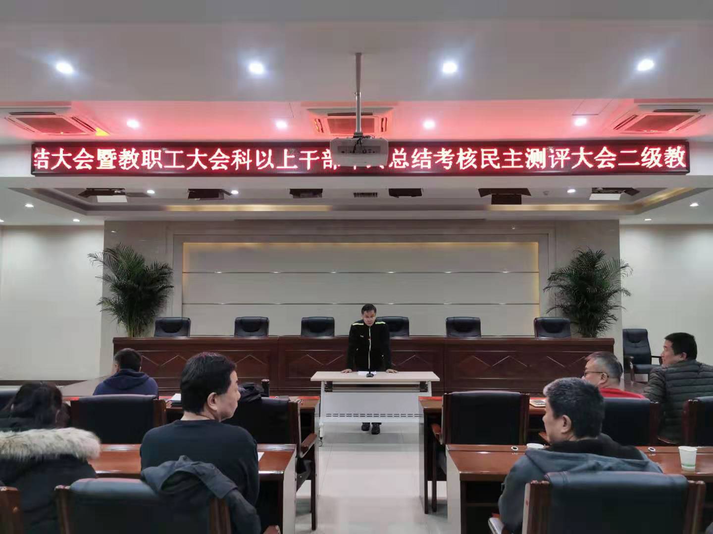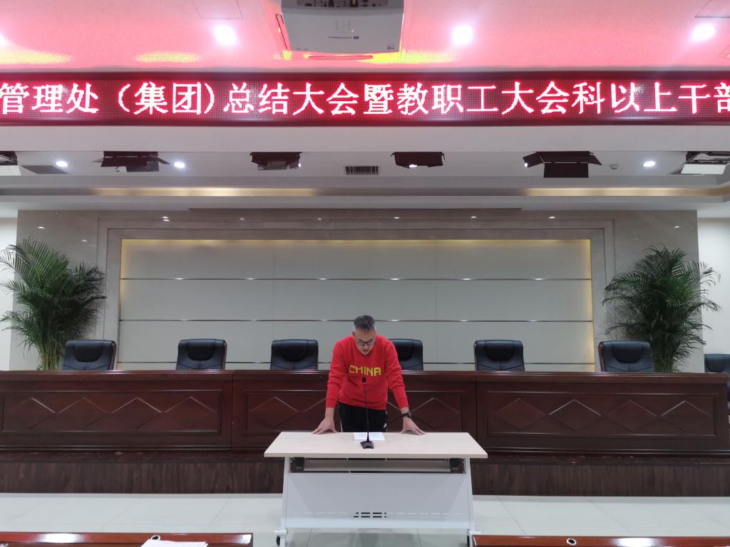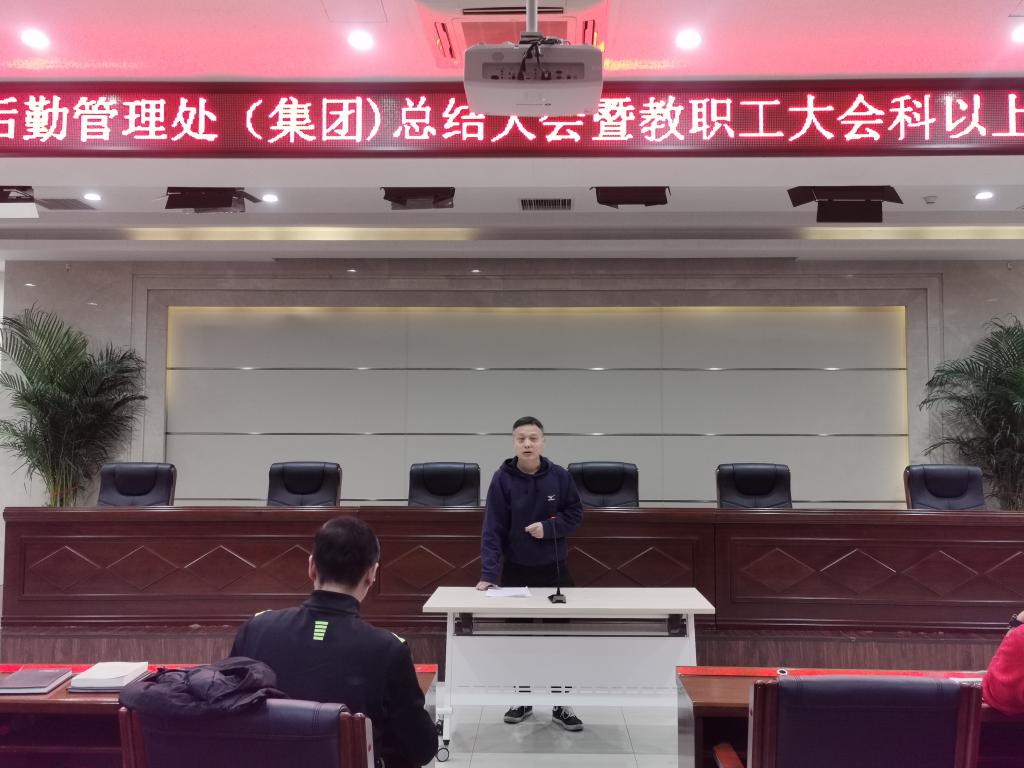 2020年1月9日下午,后勤管理处(集团)在2号行政楼6楼报告厅召开2019年后勤管理处总结大会、教职工大会、科以上干部年终总结考核民主测评大会、二级教代会,后勤管理处(集团)全体干部职工参加会议,大会由后勤管理处(集团)党总支书记宋国权同志主持。 会议开始,宋国权同志做会前发言、介绍会议议程,并向全体干部职工做个人工作述职。后勤管理处(集团)处长许伟同志代表班子做2019年后勤工作汇报,对我校家属区加装电梯二期工程、空气能设备、电讯设施光改项目等亮点工作,主题教育、平安校园等专题工作做了较为详细的汇报,许伟同志表示, 回顾2019年,后勤人敢于担当、迎难而上、奋勇拼搏,不忘服务初心,牢记保障使命,用切实行动满足我校师生对美好校园环境的期待。同时许伟同志对后勤管理处(集团)2020年的工作提出了具体要求和殷切希望,表示,全体后勤人要只争朝夕,不负韶华,不忘初心,勇当使命,再创辉煌! 后勤管理处(集团)副处长黄岗同志及后勤管理处(集团)科级干部分别针对自己工作进行述职。 述职结束,后勤管理处(集团)全体职工根据后勤管理处(集团)处科级干部的汇报情况进行民主测评。