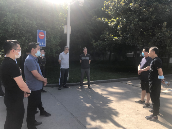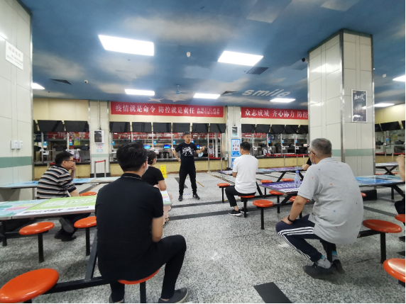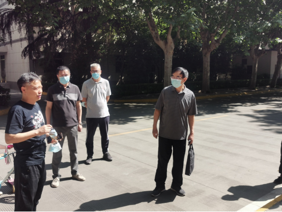 李富生(右二)指导后勤防疫演练工作 检查组首先前往2号行政楼,检查防疫准备情况,明确2号行政楼出入管理和流程的细节、消毒范围、规范消毒记录;前往教室、场馆对学生上课、突发情况等情景进行反复排演,根据实际演练,不断调相关防疫方案;前往学生餐厅进行防疫及开学准备工作检查,模拟学生错峰就餐情景,进一步完善、细化现有学生错峰就餐方案;逐一检查学生公寓防疫情况,并现场提问工作人员防疫知识、突然情况处理流程等,进一步规范工作人员各项防疫操作。
