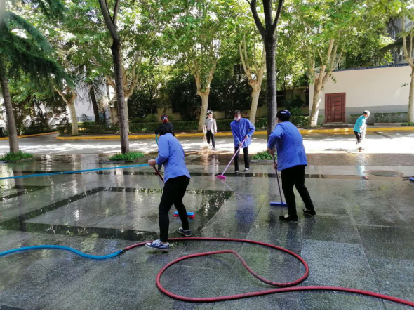 一、疫情防控工作 (一)后勤管理处(集团)保洁绿化中心在对工作人员进行体温检测、登记后,严格按照校医院要求做好我校校园环境、教室清洁、通风、消毒工作。 1、教学楼、行政楼、2号楼、家属区、垃圾场消杀; 2、冲洗教学楼门前台阶、地面; 3、完成实验楼一至六楼的卫生保洁,重点清扫卫生死角; 4、行政楼楼梯冲洗;完成行政楼大会议室卫生保洁工作; 5、清理6号公寓楼周边垃圾; 6、冲洗校园主干道; 7、校园绿植养护。