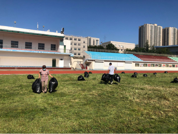 今日开始对田径场草坪进行修剪。