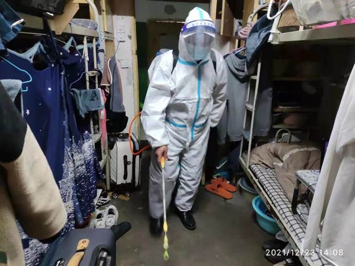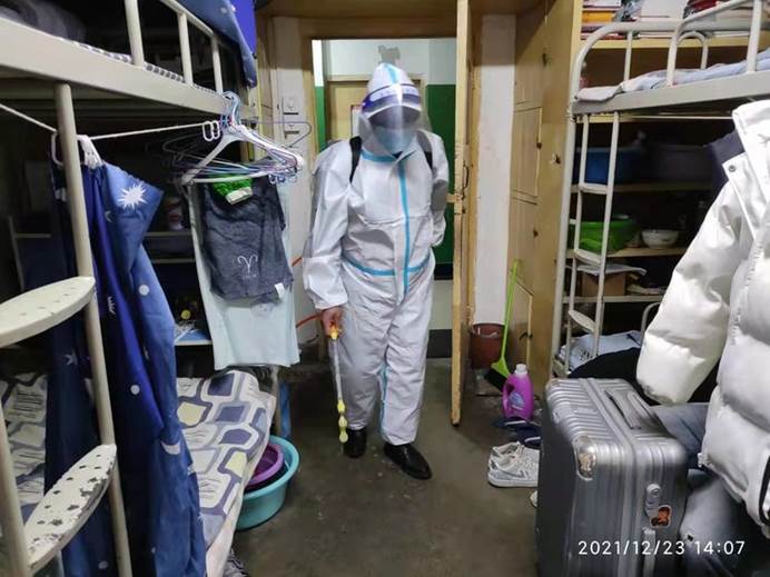 自12月9日西安爆发首例本土病例以来,学生公寓管理中心根据自身要求提前准备了充足的防疫物资。其中日常用量较大的84消毒液、过氧乙酸、酒精,口罩等均备足一个月的存量。与此同时,例行做好疫情期间学生公寓每日消杀,保证一日两次全面消杀,值班员不定时消杀,保障公寓卫生清洁。疫情期间严格门岗及公寓值班员对外来人员扫码测温职责,确保一人一扫码,并建立台帐。同时建立工作人员防疫台账,每日测温汇总,实时记录。