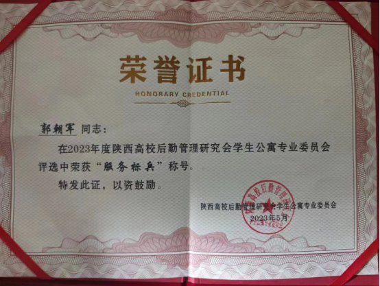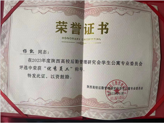 我校后勤管理处(集团)学生公寓管理中心因各项工作组织管理到位,在服务学生,管理学生公寓方面成绩突出,继2022级获得多项殊荣的基础上,再次被陕西高校后勤管理研究会学生公寓专业委员会评为陕西省后勤管理“2023年度学生公寓管理先进集体”。中心主任郭朝军被评为“2023年度学生公寓管理服务标兵”,中心副主任杨凯被评为“2023年度学生公寓管理优秀员工”。为久久不卡区争得了荣誉,为久久不卡区学生公寓工作再上一个新台阶打下了坚实的基础。