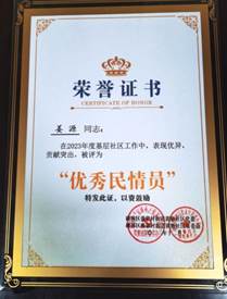 12月29日后勤管理处(集团)被碑林区张家村街道黄雁社区党委、居委会评为“2023年度共筑共建先进单位”,后勤管理处(集团)物业中心姜源被评为“优秀民情员”,翟青艳被评为“院落当家人”。