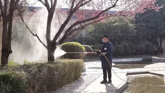因地制宜合理的分析,严格执行危险品安全使用规定,专人专管,选用低毒高效农药,控制药物比例,确保病虫害防治由表及里不交叉感染。园林绿化团队利用打药机人工喷雾作业、涂摸、浇灌等多种方式,确保校园园区、家属区防治无死角,能够有效预防春季病虫害的滋生,改善绿植、苗木、花卉等生长状况,确保校园春季桃花、广玉兰、连翘、樱花等在不同时期健康生长。