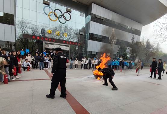 为了进一步强化校园安全生产工作,增强广大教职工、师生消防安全意识,提高自救防范能力,做到发生火灾时,能临危不乱,有序、快速地按消防逃生路线安全撤离,确保生命安全,3日27日下午在田径馆西门,物业中心参加由保卫处组织的消防灭火演练。