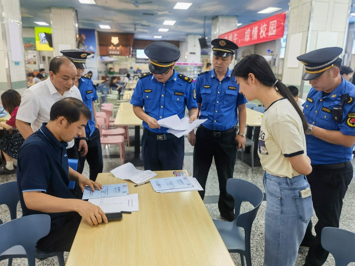 6月11日下午,市、区执法大队联合对我校学生餐厅油烟排放系统进行专项督导检查。