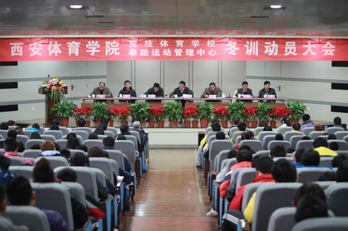 12月12日下午三点,竞技体育学校与拳跆运动管理中心在教学楼一楼报告厅召开了2011年度冬训动员大会。陕西省体育局副局长姚金荣及竞体处处长董利、我院院长苏明理、竞训处处长邵强、场馆处处长宋国权、健康科学系主任王琨、体育教育系主任周家颖、武术系主任马文国、竞训处副处长杨亚玲、拳跆运动管理中心顾问金学斌教授应邀参加了会议。