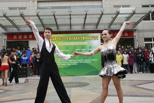 12月15日下午,由国家体育总局青少年体育司、教育部体卫艺司主办,国家体育总局体育科学研究所、体育管理在线共同承办,陕西省体育局协办的“2010年阳光体育科学健身校园行”活动在我院校园举行。本次活动以“走向操场,走到阳光下,积极参加体育锻炼”为主题,共分为健身知识展示、健身科学大讲堂、阳光体育展示三大部分。