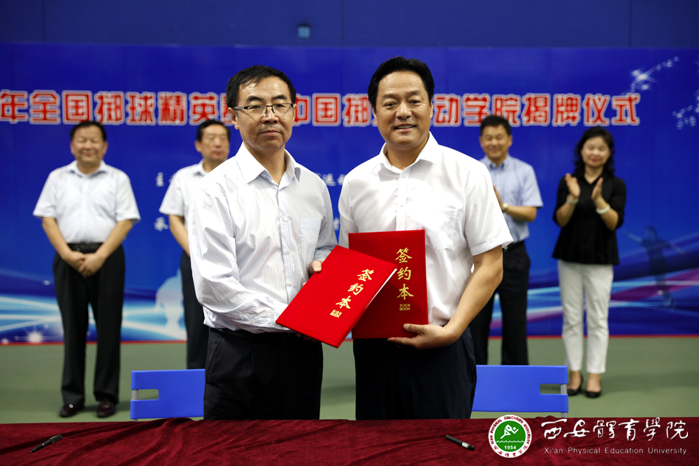 王立伟与陕西省体育局局长姚金荣为“中国掷球运动学院”揭牌