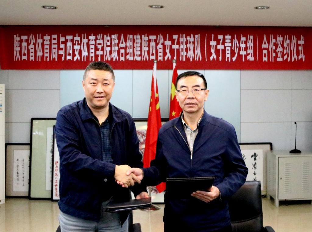 本网讯 9月26日上午,我院与陕西省体育局举行联合组建省女子排球队(青少年组)签约仪式。省体育局副局长邹军,我院院长朱元利、副院长刘新民出席。签约仪式由刘新民主持。