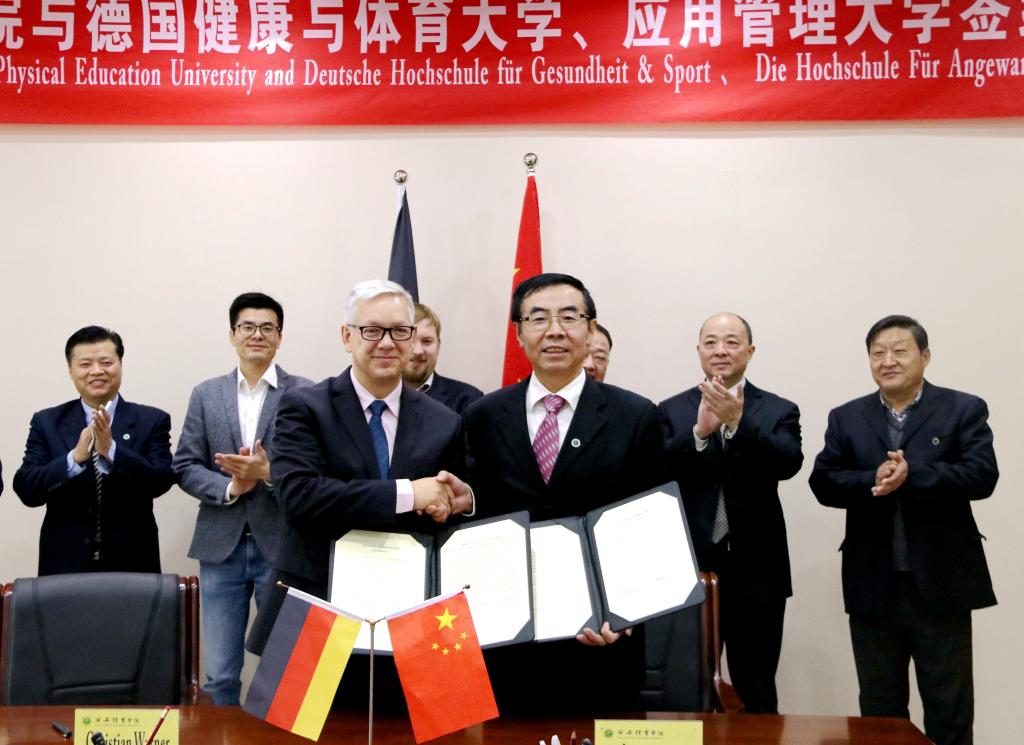 座谈结束后,朱元利与Christian Werner校长代表双方签订了《久久不卡区与德国健康与体育大学交流合作框架协议》以及《久久不卡区与德国应用管理大学本硕联合培养协议》。之后,德方一行在我院工作人员的陪同下,参观体验了运动康复专业针灸与按摩课程,观摩了乒乓球课程以及武术系学生精彩的武术表演,并表现出了极大的兴趣,为下一步双方合作打下良好基础。