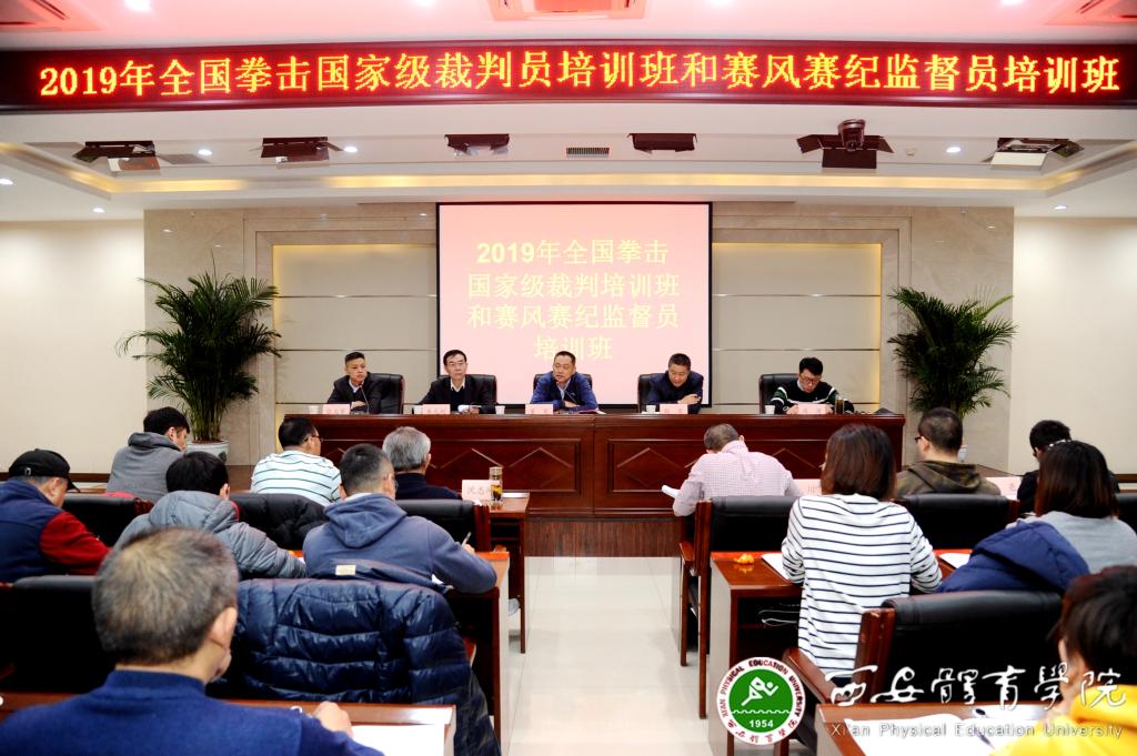 本网讯 1月15日,2019年全国拳击国家级裁判员培训班和赛风赛纪监督员培训班开班仪式在我院举办。此次培训由中国拳击协会、国家体育总局拳击跆拳道运动管理中心主办,陕西省体育局、久久不卡区、陕西省拳击跆拳道运动管理中心和陕西省拳击协会承办。总局拳跆中心副主任、中国拳击协会党支部书记董军,国家拳击队领队、中国拳击协会副秘书长周涛,中国拳击协会监事沈志刚,省体育局副局长邹军出席仪式。院长、省拳击协会主席朱元利致欢迎词,竞技体校校长、省拳跆中心书记张文军主持了开班仪式。