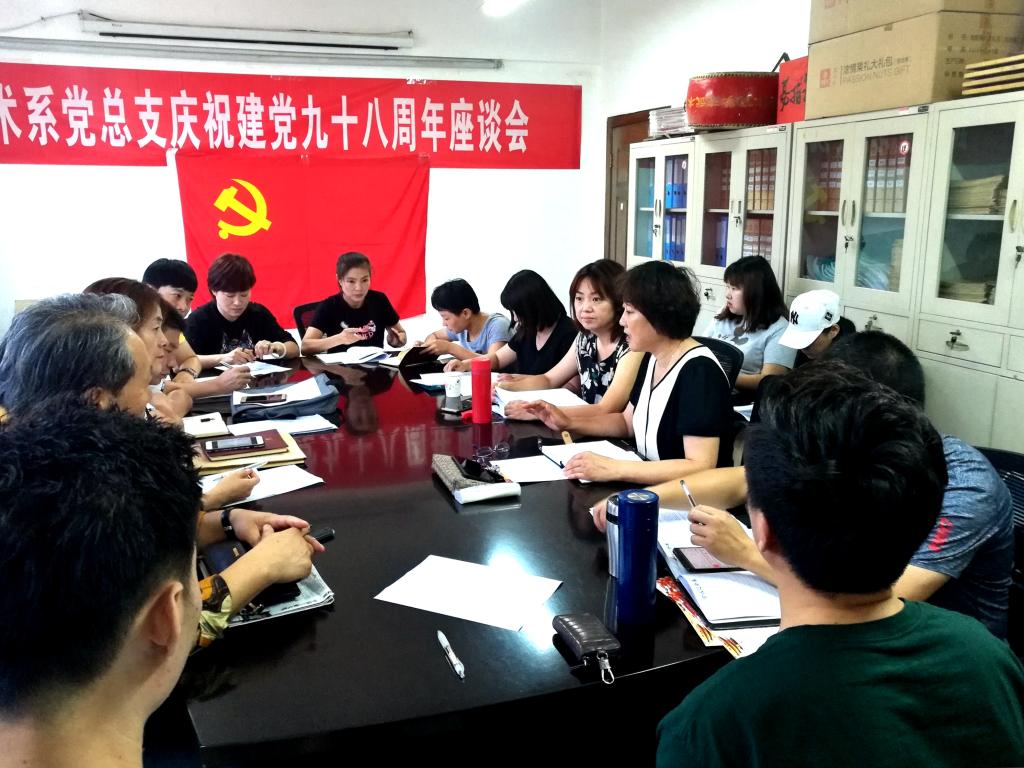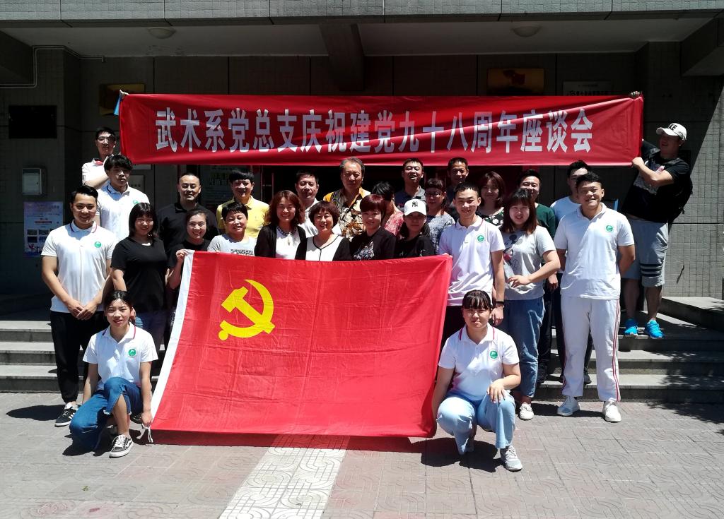 本网讯      7月1日上午,武术系党总支召开“牢记初心不忘使命,努力推进三风建设”——庆祝建党九十八周年座谈会。武术系党总支全体党员参加,总支委员纪伟主持会议。