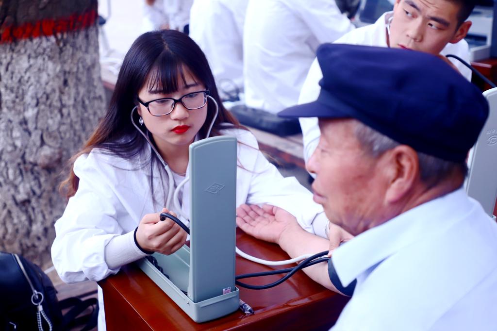 志愿者为当地老人进行体质检测