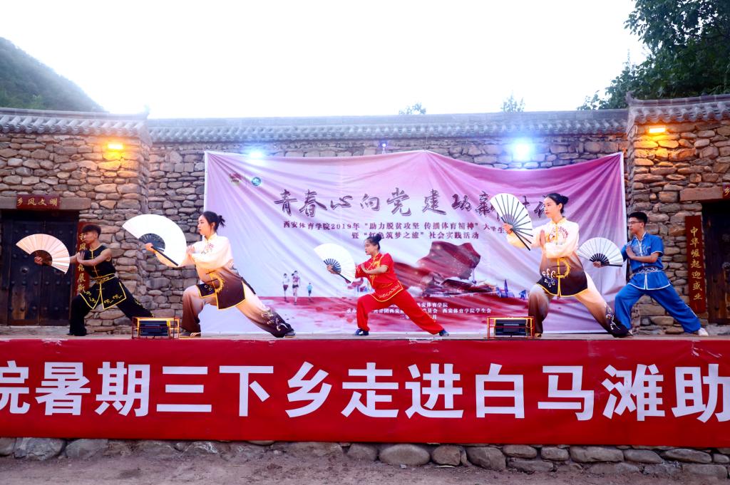 体育艺术展演服务团先后在延安黄龙县界头庙镇、白马滩镇、西街社区广场、铜川王益区馨苑小区、孟姜源村、安康汉滨区县河镇、水西门广场、汉阴中学、平梁镇沙河村、铁佛寺镇等地进行了13场精彩表演,展示了艺术体操、体育舞蹈、武术、瑜伽、花式篮球等体育特色文艺节目,受到当地群众热烈欢迎。参演志愿者牟阳秋说:在安康演出时,一位老人拉着我的手,激动地说,第一次在家门口看到这么精彩的表演,谢谢服务团的娃娃们。