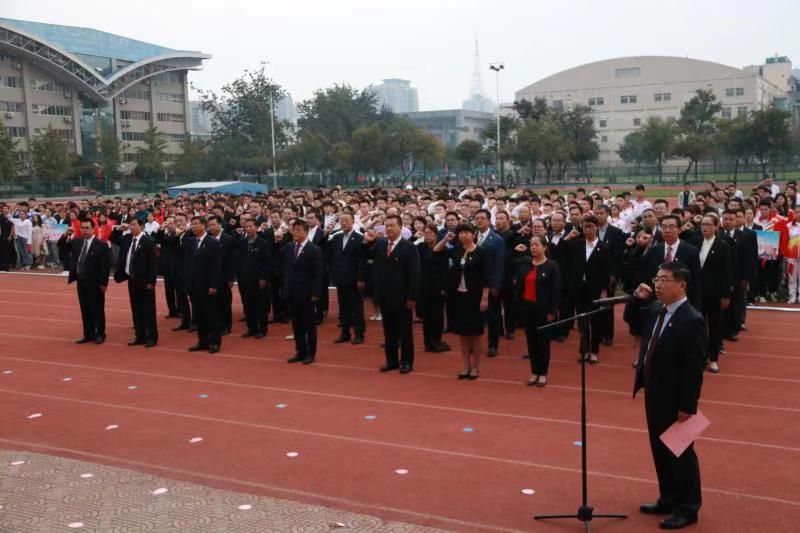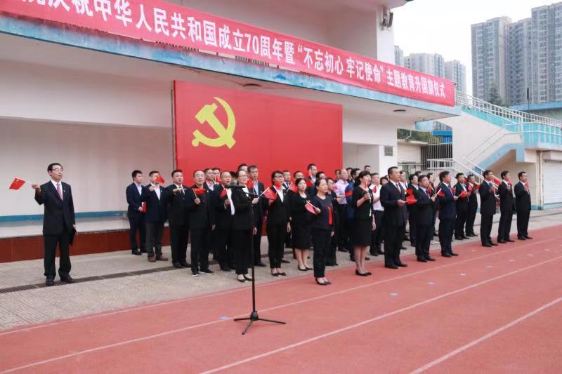 本网讯    为热烈庆祝中华人民共和国成立70周年,深入开展“不忘初心,牢记使命”主题教育,激发教职员工牢记“为党育人、为国育才”初心和全体学生“为中华之崛起而读书”使命,充分点燃全校师生的爱国主义情怀,进一步增强全校上下的凝聚力、创新力、战斗力,10月1日,我校举行庆祝中华人民共和国成立70周年暨“不忘初心 牢记使命”主题教育升国旗仪式,全体校领导,各二级单位党委(总支)书记、主要负责人,党员师生代表等800余人参加了仪式。党委书记黄道峻为师生上了“不忘初心 牢记使命”主题教育党课;校长朱元利主持了仪式。