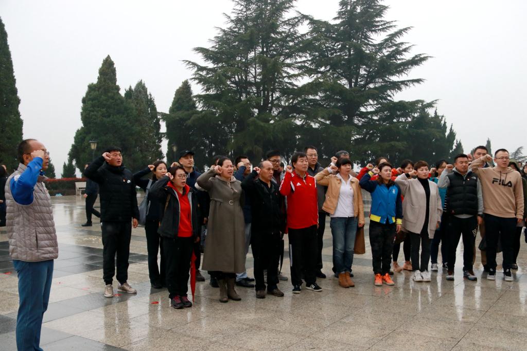 在英雄纪念碑下,面对鲜红的党旗,全体党员重温入党誓词,在足球学院副院长席海龙的带领下庄严宣誓,铿锵有力的誓言响彻纪念碑广场。随后全体党员在纪念碑前肃立、三鞠躬,并环绕纪念碑一周以寄哀思,感恩革命先烈们伟大无私、不怕牺牲的革命精神。