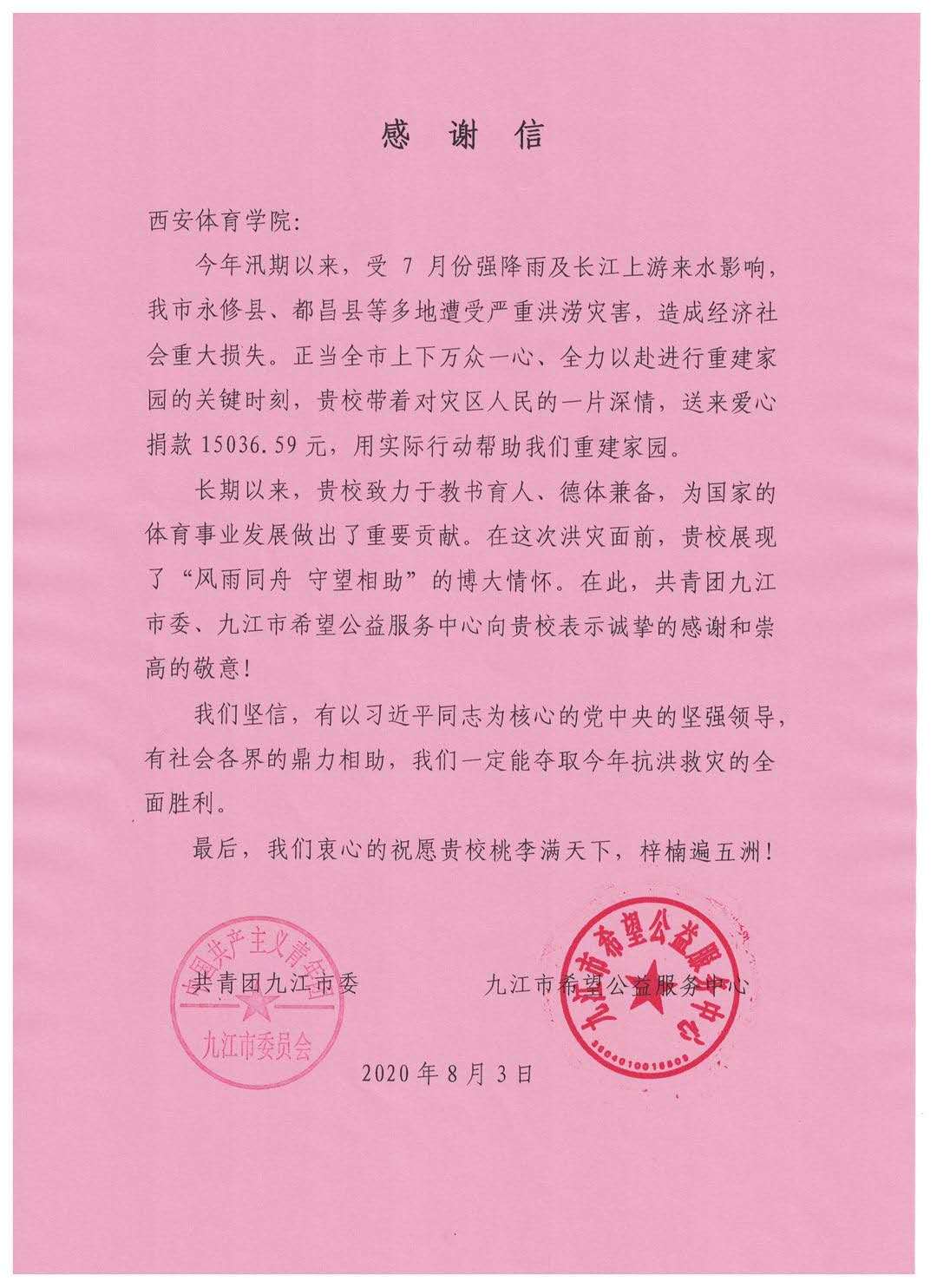 我校团委向共青团九江市委捐款,并收到感谢信
