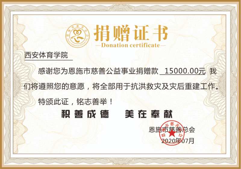 向恩施慈善总会捐款证书