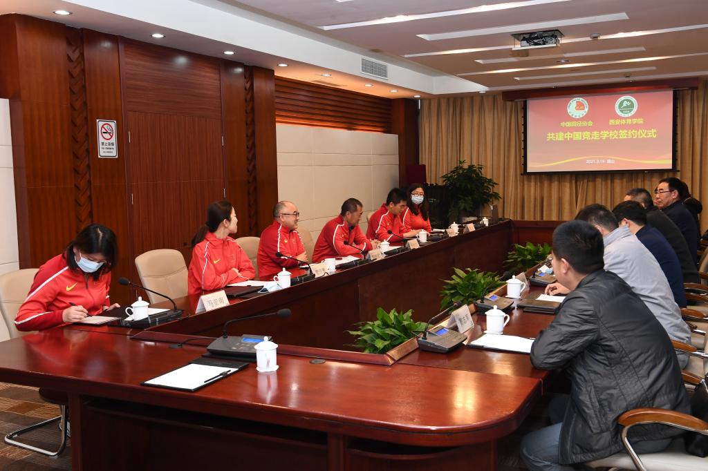 本网讯 3月19日,我校与中国田径协会在黄山签署合作协议,继续共建中国竞走学校,以期充分借助举国体制创新促进竞走项目进一步发展,为国家队不断培养高水平竞走人才。中国田径协会副主席兼秘书长于洪臣、中国田径协会副主席田晓君、陕西省体育局副局长邹军、我校校长刘子实、原校长朱元利等出席签约仪式。