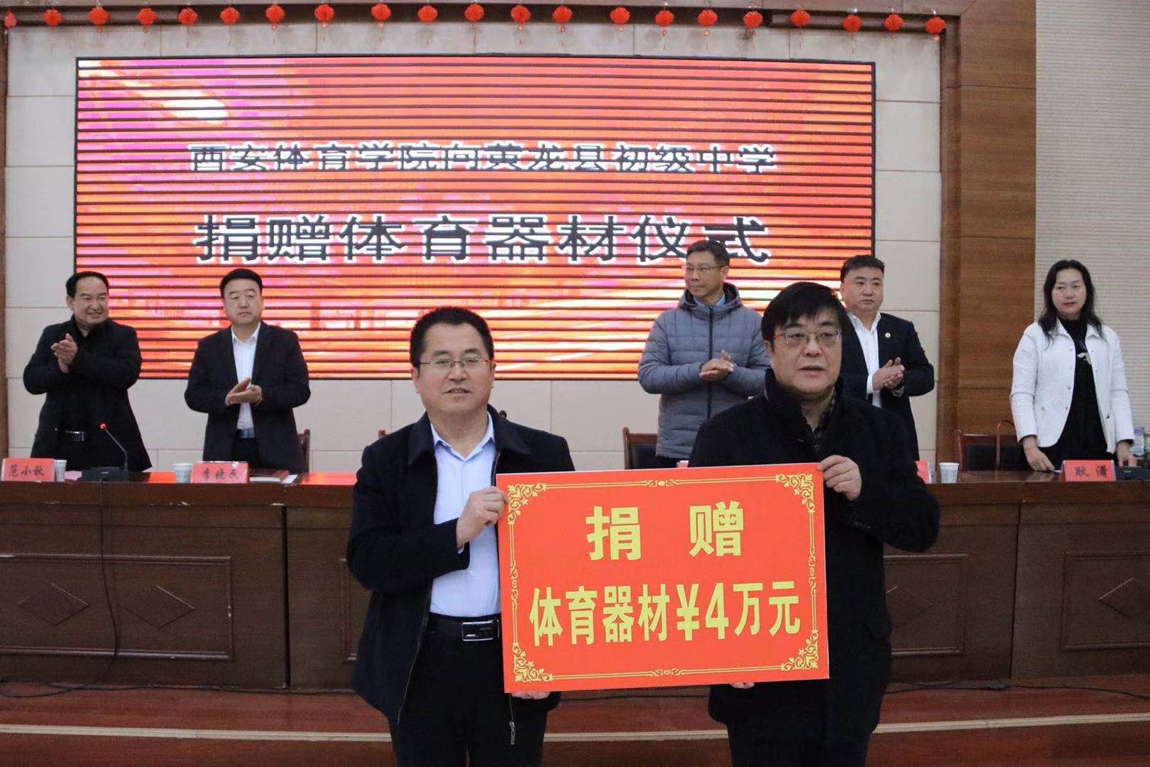 黄道峻代表学校向黄龙县初级中学捐赠了足球、篮球、排球、乒乓球拍、羽毛球拍等价值4万元的体育器材。