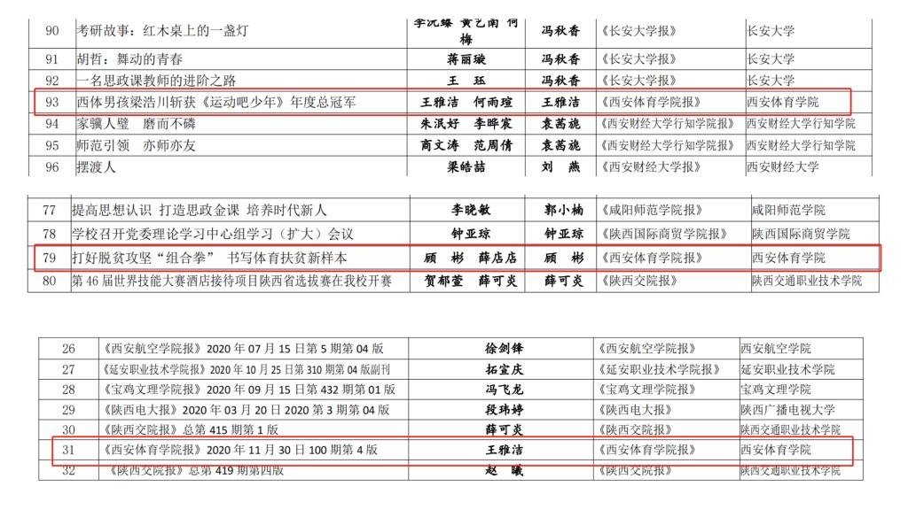3月中旬,按照陕西省高校校报协会关于参评工作通知的要求,我校校报共选送参评作品6件,获奖3件。其中,顾彬和薛店店撰写的《打好脱贫攻坚“组合拳” 书写体育扶贫新样本》获消息类二等奖,王雅洁和何雨瑄共同采写的《西体男孩梁浩川斩获<运动吧少年>年度总冠军》获通讯类二等奖,王雅洁担任责任编辑的《久久不卡区报》100期第四版获版面类二等奖。