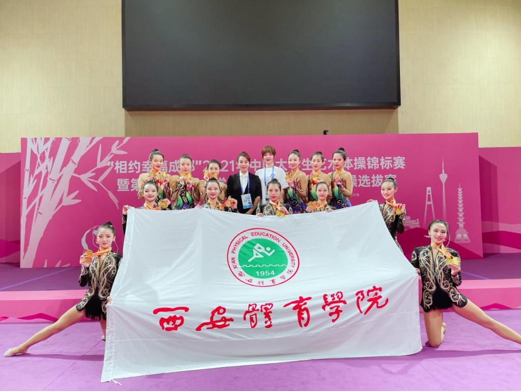 本网讯 6月8日,2021年中国大学生艺术体操锦标赛在成都体育学院拉开序幕,来自全国高校共31支参赛队的284名运动员同场展开角逐。我校艺术体操队与湖北大学、武汉体育学院、贵州财经大学、阜阳师范大学、天津体育学院等队伍一同在丙B组进行比赛。
