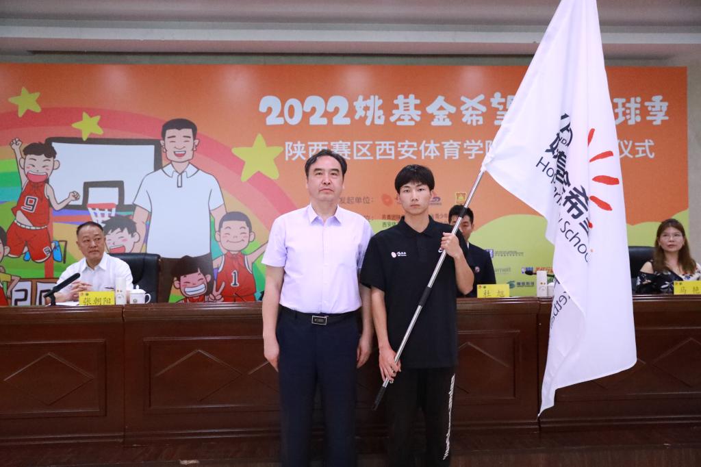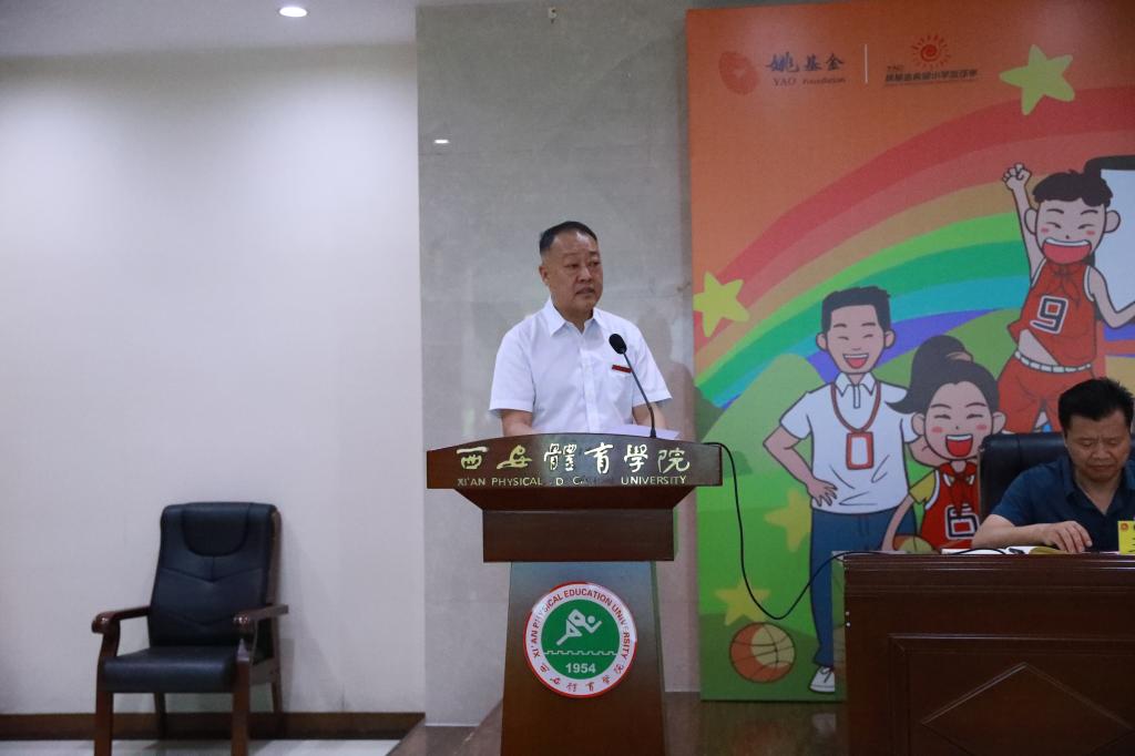 本网讯 5月23日上午,我校2022年“姚基金希望小学篮球季”支教志愿者出征仪式在二号行政楼六楼报告厅举行,陕西省希望办公室主任、省青少年发展基金会秘书长乌钢,陕西省篮协秘书长杜旭,陕西省青少年发展基金会副秘书长常江,校党委委员、党委宣传部部长张朝阳及相关职能部门负责人、二级学院党委书记、二级学院团委书记、全体志愿者、在校生代表参加了出征仪式。校团委综合部副部长雷云主持出征仪式。