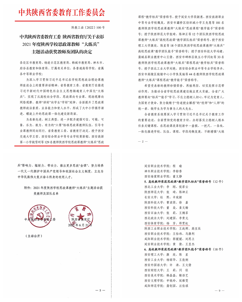 本网讯 日前,陕西省委教育工委、陕西省教育厅发布《关于表彰2021年度陕西学校思政课教师“大练兵”主题活动获奖教师及团队的决定》(陕教工函〔2022〕100号),我校马克思主义学院教师杨芳带领体育新闻与传媒学院学生郑贯虹获得陕西学校思政课教师“大练兵”高校思政课“教学团队标兵”荣誉称号。我省共有包括西北工业大学在内的12所学校的教学团队获此殊荣。