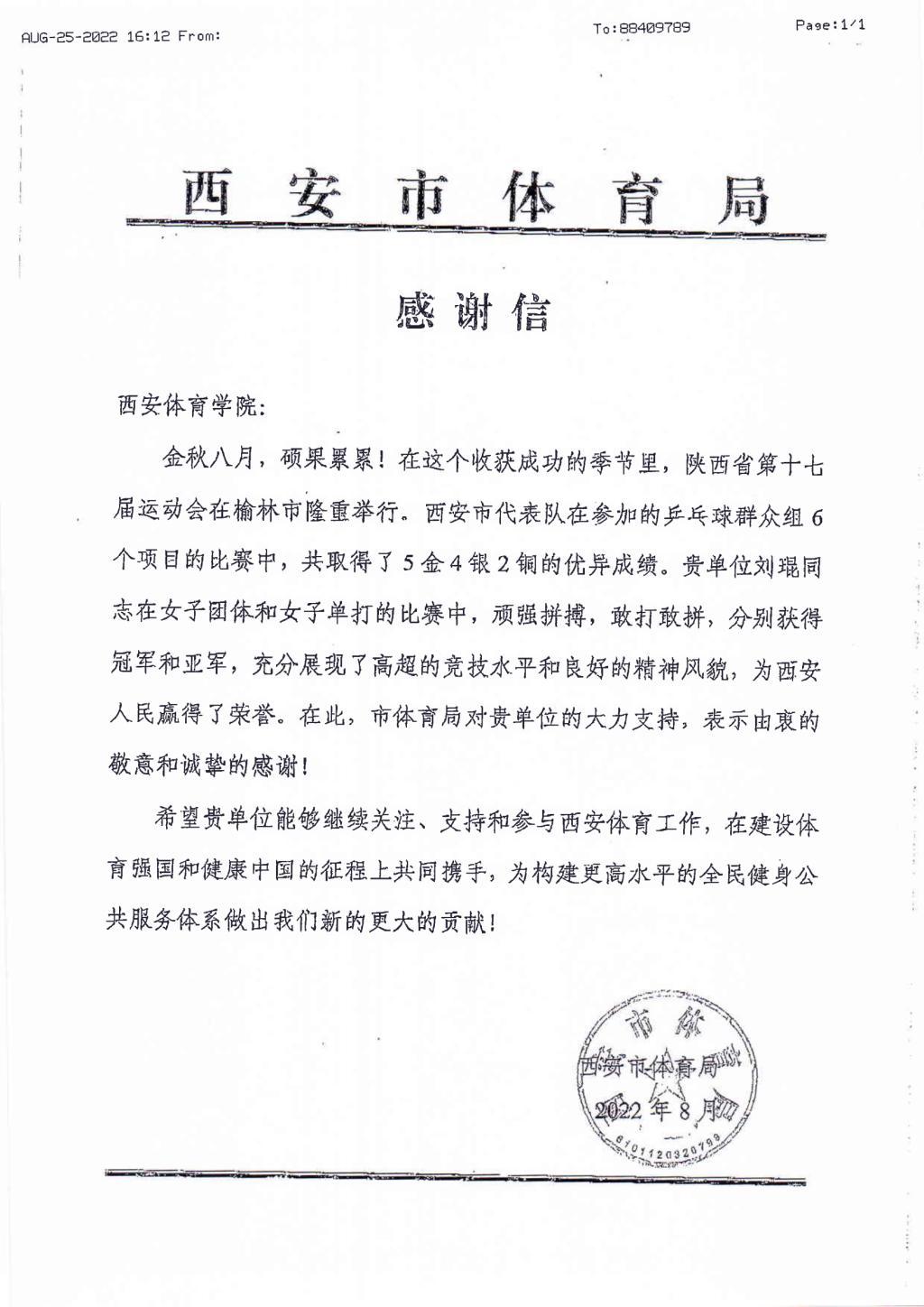 本网讯 2022年8月6日至11日,陕西省第十七届运动会在榆林举办。我校乒羽教研室刘琨老师代表西安市参加了乒乓球赛事,在比赛中顽强拼搏,敢打敢拼,充分发挥自己的竞技水平,以全胜的战绩助西安市代表队获得团体冠军,同时个人获得女子单打亚军。