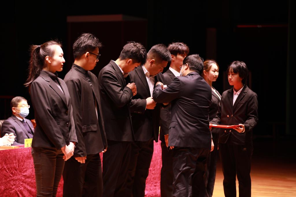 校党委书记黄道峻为2022级新生代表佩戴校徽。