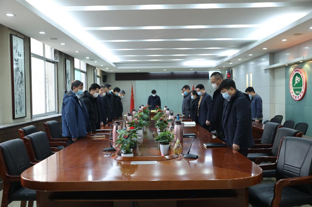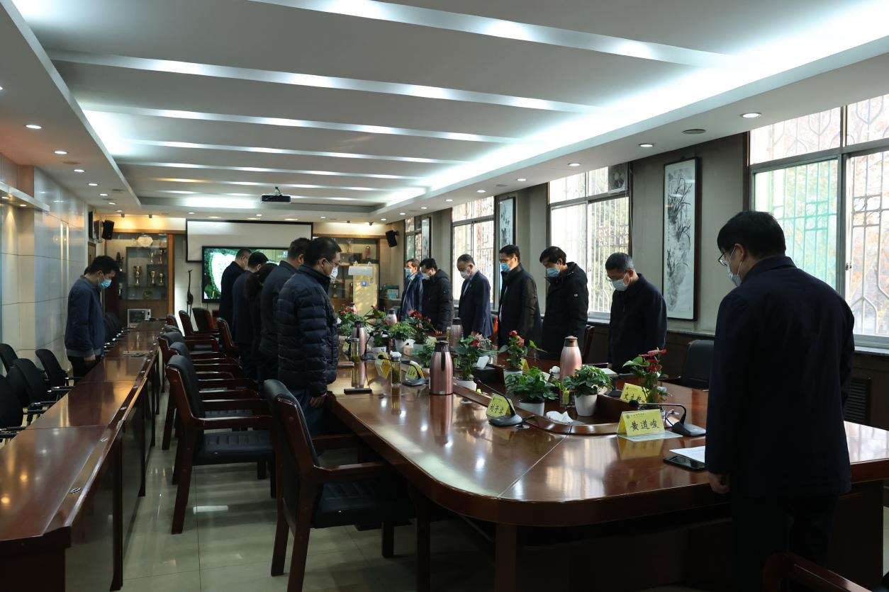 校党委理论学习中心组成员在行政楼二楼会议室收看追悼会现场直播,会场肃穆,哀乐低回,大家集体默哀,认真聆听学习习近平总书记所致悼词。