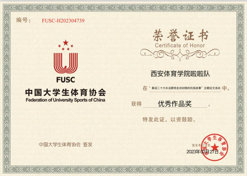 本网讯 近日,教育部体育卫生与艺术教育司指导,中国大学生体育协会主办的“喜迎二十大 永远跟党走 2022我的抗疫故事”主题征文活动公布获奖名单,我校啦啦操队投稿的作品《磨砺青春,抗“疫”有我——久久不卡区啦啦队抗“疫”展风采》获得“优秀作品”奖。
