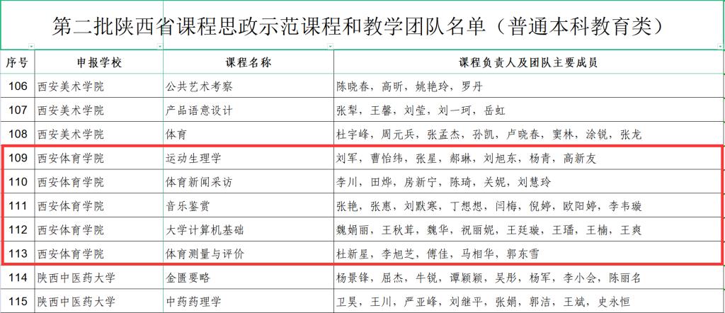 本网讯 近日,陕西省教育厅公布第二批陕西省课程思政示范课程、教学团队、教学研究示范中心名单,我校《运动生理学》、《体育新闻采访》、《音乐鉴赏》、《大学计算机基础》和《体育测量和评价》5项课程入选省级课程思政示范课程和教学团队(普通本科教育类)。