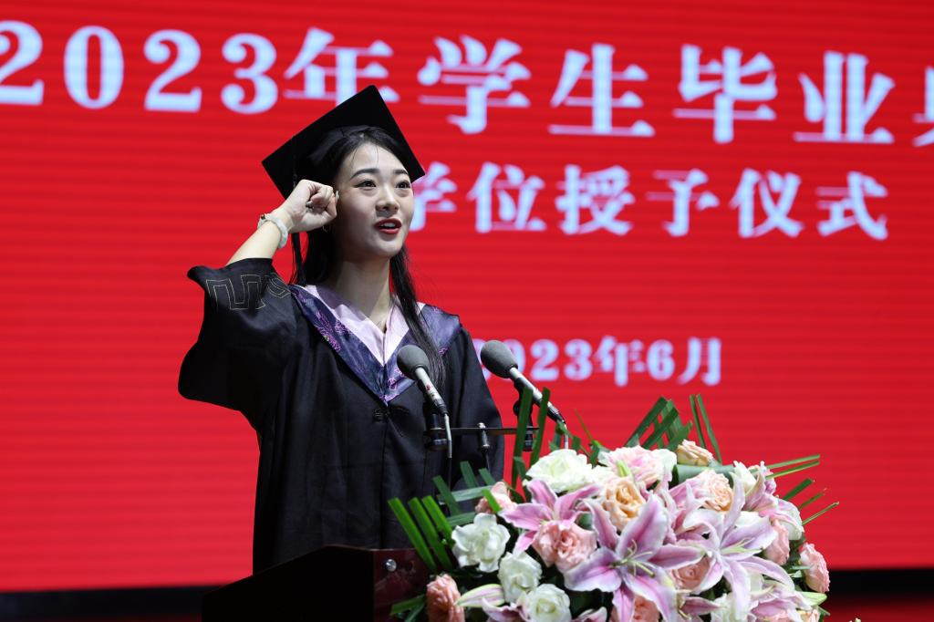 来自体育新闻与传媒学院的2023届毕业生田佳灵带领全体毕业生庄重宣誓。