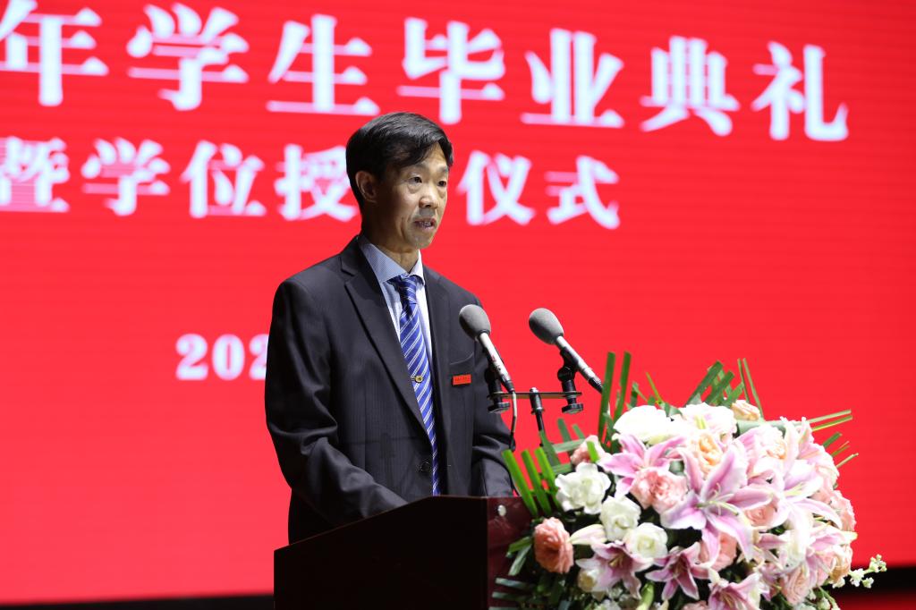 我校运动休闲学院网球教研室冯加付教授作为教师代表为2023届毕业生送上四十字衷心祝福:与人为善、懂得感恩,坚持学习、不断修炼,诚信做人、踏实做事,百折不挠、笑对逆境,不忘初心、追逐梦想。希望广大毕业生在人生的花园里种下拼搏的种子,开出祖国需要的希望之花。