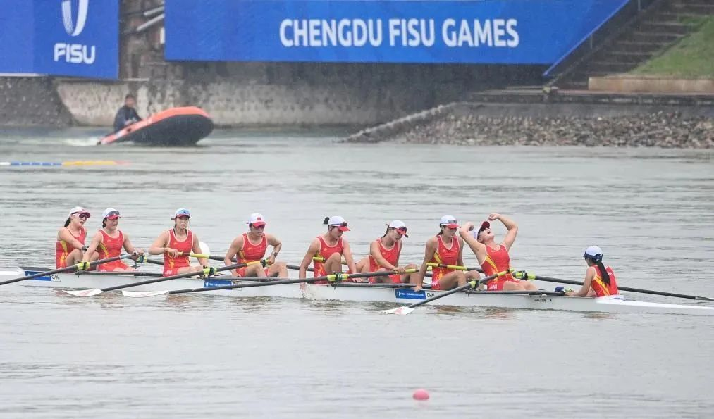 在8月6日下午进行的女子八人单桨有舵手的决赛中,2022级学生鞠汶君与队友以6分25秒03的v成绩为大运会再添一枚金牌。