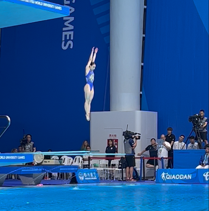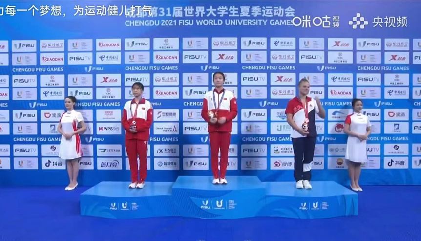 8月1日,在成都第31届世界大学生夏季运动会举行跳水项目女子1米跳板决赛中,陕西跳水新秀、我校2020级学生王壹以280.35分摘得银牌。而在8月7日,在举行女子团体跳水比赛中,王壹搭档队友,以3145.63分的总成绩超越韩国女子跳水队925.83分摘得女子团体金牌!