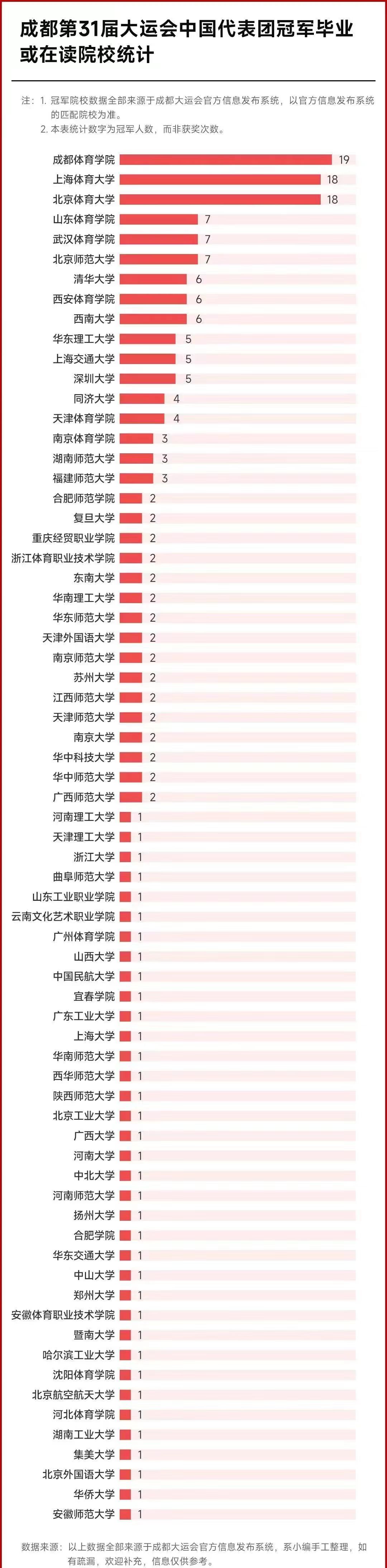 本网讯    8月8日,第31届世界大学生夏季运动会于成都闭幕。我校6名运动员入选中国体育代表团,并参加田径、赛艇、跳水、射击4个大项、10个小项的角逐,共获得6金、1银、2个第四名、1个第六名的优异战绩,在本届大运会的高校冠军数量排行榜上位列第八。此外,我校还有3名教师以教练员和裁判员身份参加大运会,田径教练王志平作为教练员一同前往大运会赛场,教师马海涛、孙梅在体操、排球等项目上进行执裁。