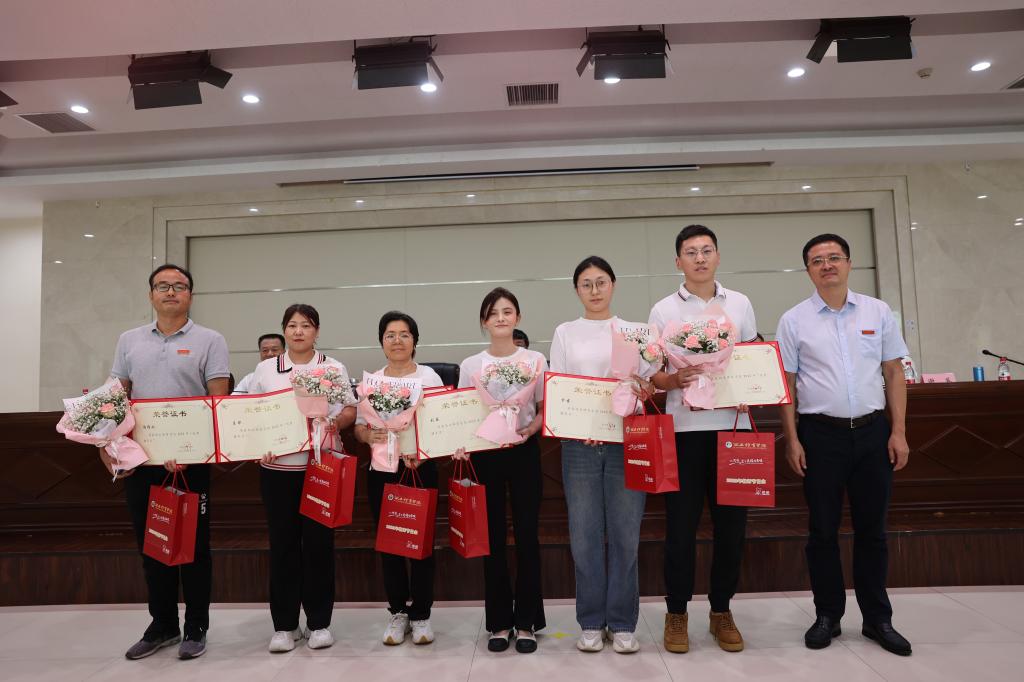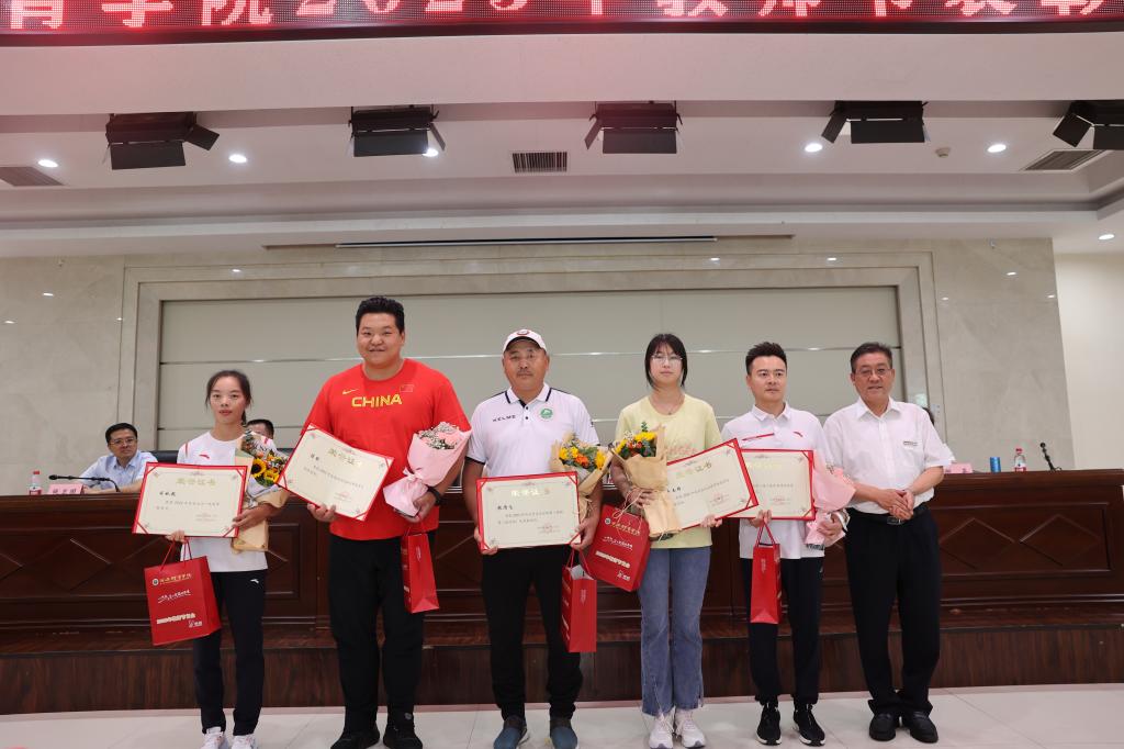 党委副书记高玉峰分别给荣获2022年体育运动一级奖章教练员蒋秋艳;荣获2022年全国田径投掷项群赛男子铅球冠军陈剑荣获2023陕西大学生足球联赛一级联赛(超级组)优秀教练员张雁飞;荣获2023年杭州亚运会撑竿跳高项目参赛资格牛春格;荣获陕西省第八届少数民族传统体育运动会优秀组织奖朱海楠颁奖。