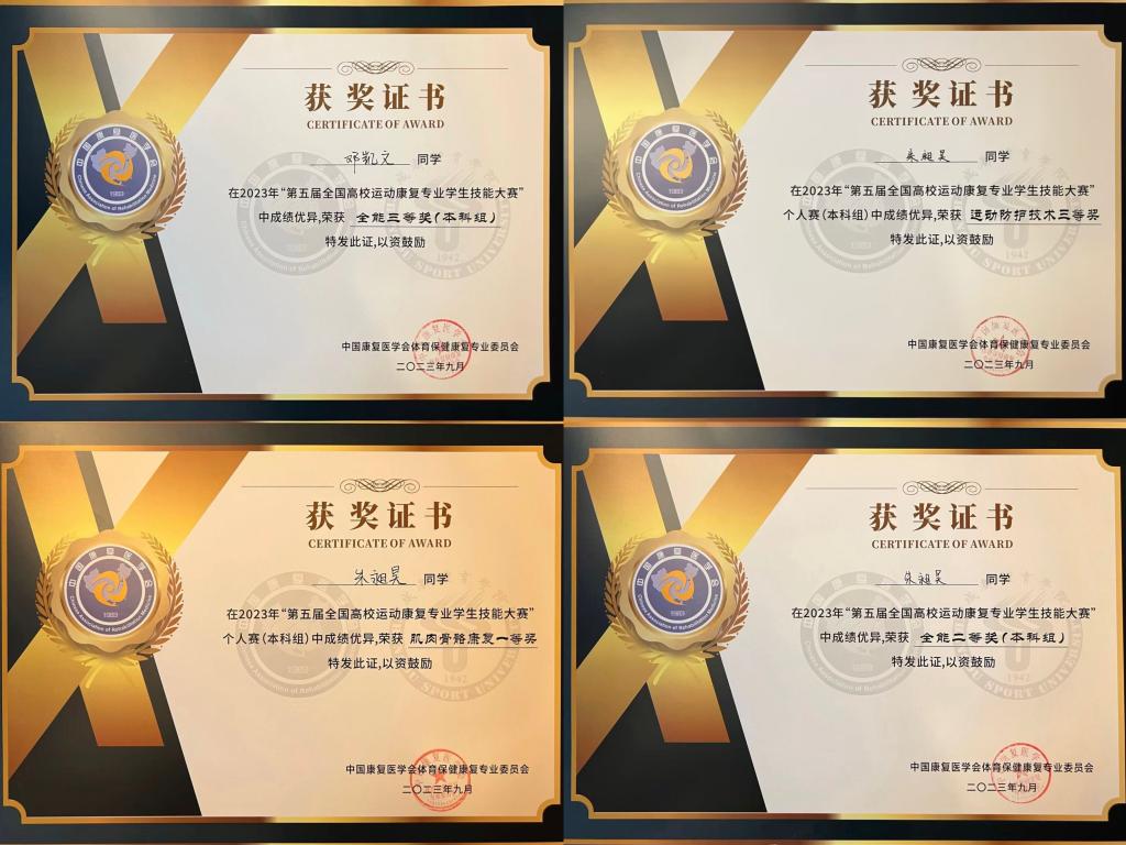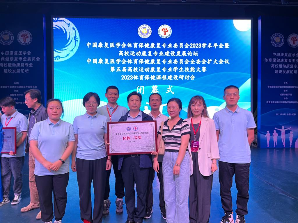 本网讯 2023年9月22日-25日, 第五届全国高校运动康复专业学生技能大赛在成都体育学院举行,我校运动与健康科学学院党委书记刘勇带队,运动医学(康复)教研室苟波、翟俊娜、邵丽娜三位老师和朱昶昊、邓凯文、李佳、沈宇杰四名学生组成的久久不卡区代表队经过两天紧张激烈的理论及实践技能比赛,荣获大赛团体二等奖,朱昶昊同学荣获肌肉骨骼康复项目个人一等奖、个人全能项目二等奖、运动防护技术项目个人三等奖,邓凯文同学荣获个人全能项目三等奖的优异成绩。这是我校康复专业学生参加历届大赛取得的最好成绩。