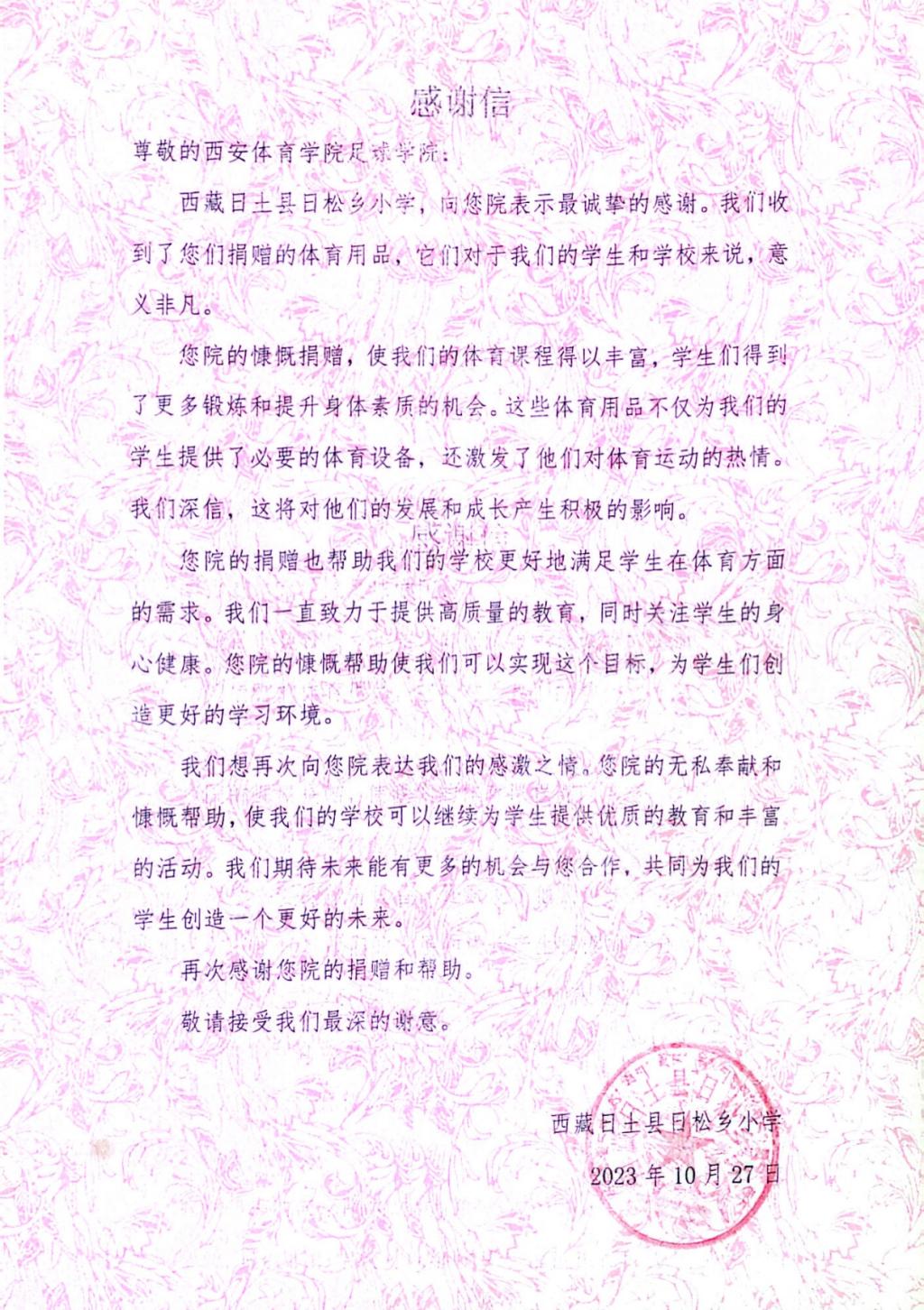 经过全院师生的爱心奉献,第一批捐赠物资于今年9月顺利送达日松乡小学。同时,足院学子也向西藏阿里日松乡小学的孩子们送上祝福。