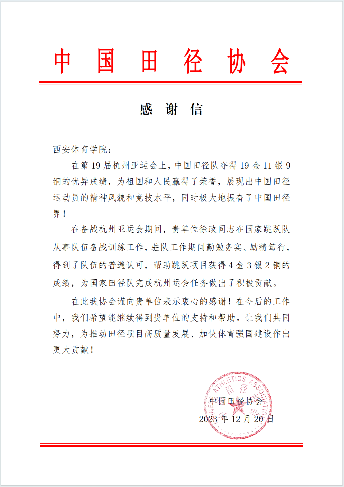 此外,中国田径协会发来感谢信,对我校教师徐政为国家田径队备战杭州运会做出的积极贡献表示感谢。徐政在驻队工作期间勤勉务实、励精笃行,帮助跳跃项目获得4 金 3 银 2 铜的优异成绩,顺利完成杭州运会任务。中国田径协会希望未来加强合作,携手并肩,在推动田径项目高质量发展、加快体育强国建设的道路上砥砺前行,勇攀高峰!