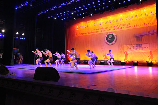 当天晚上,泰国泰拳专业队和我院武术运动员在艺术馆大礼堂为观众上演了两国武艺国粹,让大家切身感受到泰拳的魅力和中国武术的博大精深。泰拳选手的飞肘、飞膝无不令观众喝彩,他们的动作连贯性很强,飞肘加鞭腿相当迅速,动作潇洒,且击打威力极大。泰拳选手编创的节目形式多样,观赏性强,还穿插了许多剧情,使在场观众对泰拳及泰国文化有了更广泛的兴趣。泰拳表演之后,我院武术系学生还奉献了精彩的武术表演:南拳气势磅礴,吐气发力,稳桥硬马,博得了一个开门红。红拳凛然风骨,形意进退生威,太极拳内外兼修、刚柔相济,劈挂拳长刁冷抽、吞吐开合,翻拳短打紧密、双拳翻飞,中国传统刀剑劈、刺、崩、斩、截,虎虎生风,天岐棍在长短兼施中搬、砸、扭、扣,倏忽变化……十多种武术一一登场,体现了中国武术丰厚的文化意蕴。武术系主任马文国在现场中英文解说,也博得观众阵阵喝彩。