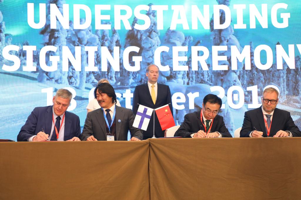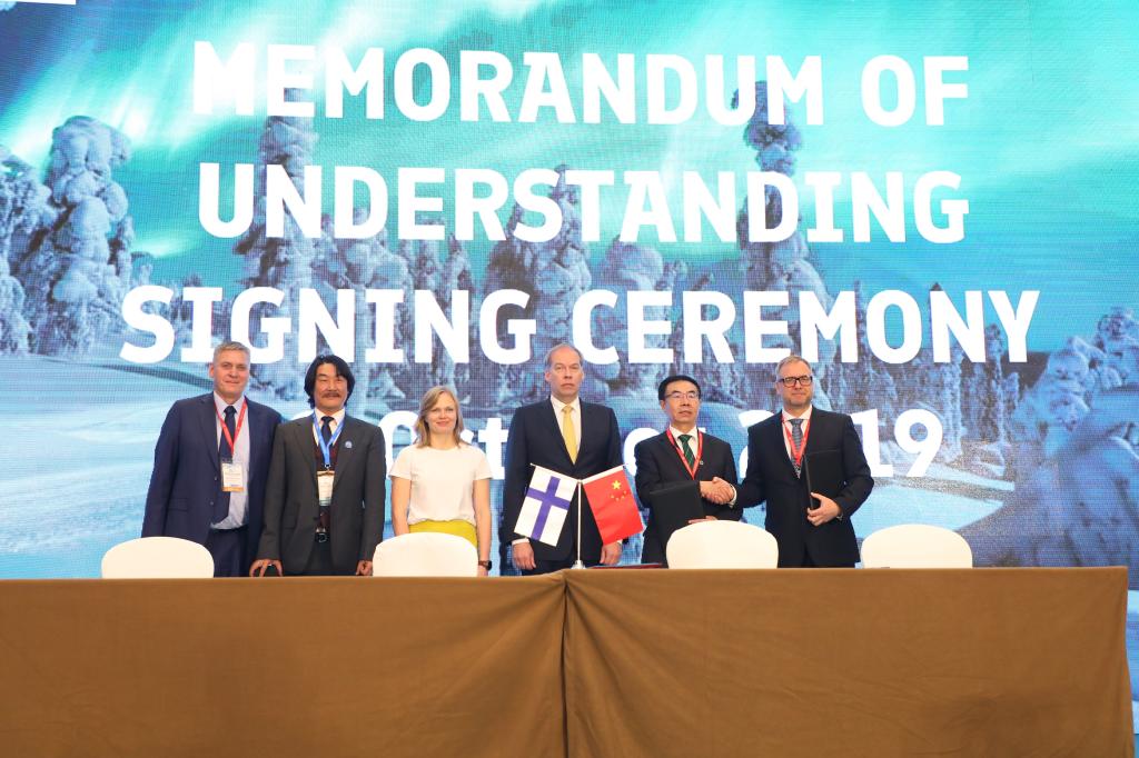 芬兰驻华大使Jarno Syrjälä(中)芬兰教育和文化部长Hanna Kosonen女士(中)见证签约