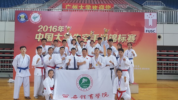 十月的羊城,秋高气爽。2016年全国大学生空手道锦标赛于10月11日在广州大学体育馆拉开帷幕,本次比赛共有来自全国30所大学300余名运动员参赛。经过三天的鏖战,我院大学生空手道代表队成功卫冕男子团体组手冠军,同时在男子B组组手-75公斤级、男子B组组手+79公斤级、女子B组组手-49公斤级、女子C组组手-61公斤级分获冠军,男子B组组手+79公斤级、女子B组组手-49公斤级冠军的获得是该项目新的突破。本届比赛,我院共取得了5金6银4铜,奖牌和团体总分第一名的辉煌成绩,并获得“体育道德风尚奖”,为学院赢得了荣誉。在空手道项目已列入2020年东京奥运会比赛项目的历史时刻,此次比赛意义深远!