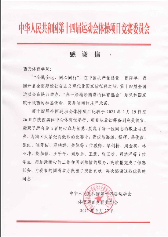 和谐中国,全民全运。在中华人民共和国第十四届运动会中,体育教育学院共有近百名师生倾心参与,其中裁判员15人,执裁田径、游泳、体操等项目的比赛,各项目技术官员及工作人员8人,学生志愿者 56人,并且周家颖等老师带队为在本届全运会取得优异成绩的陕西滑板队和竞走队提供了为期四年的科技服务。体育教育学院师生以饱满的工作热情和认真负责的态度,充分发扬西体精神,切实履行职责,圆满完成了本次全运会安排的各项工作,也进一步点燃我院所有师生的工作热情和学习动力。