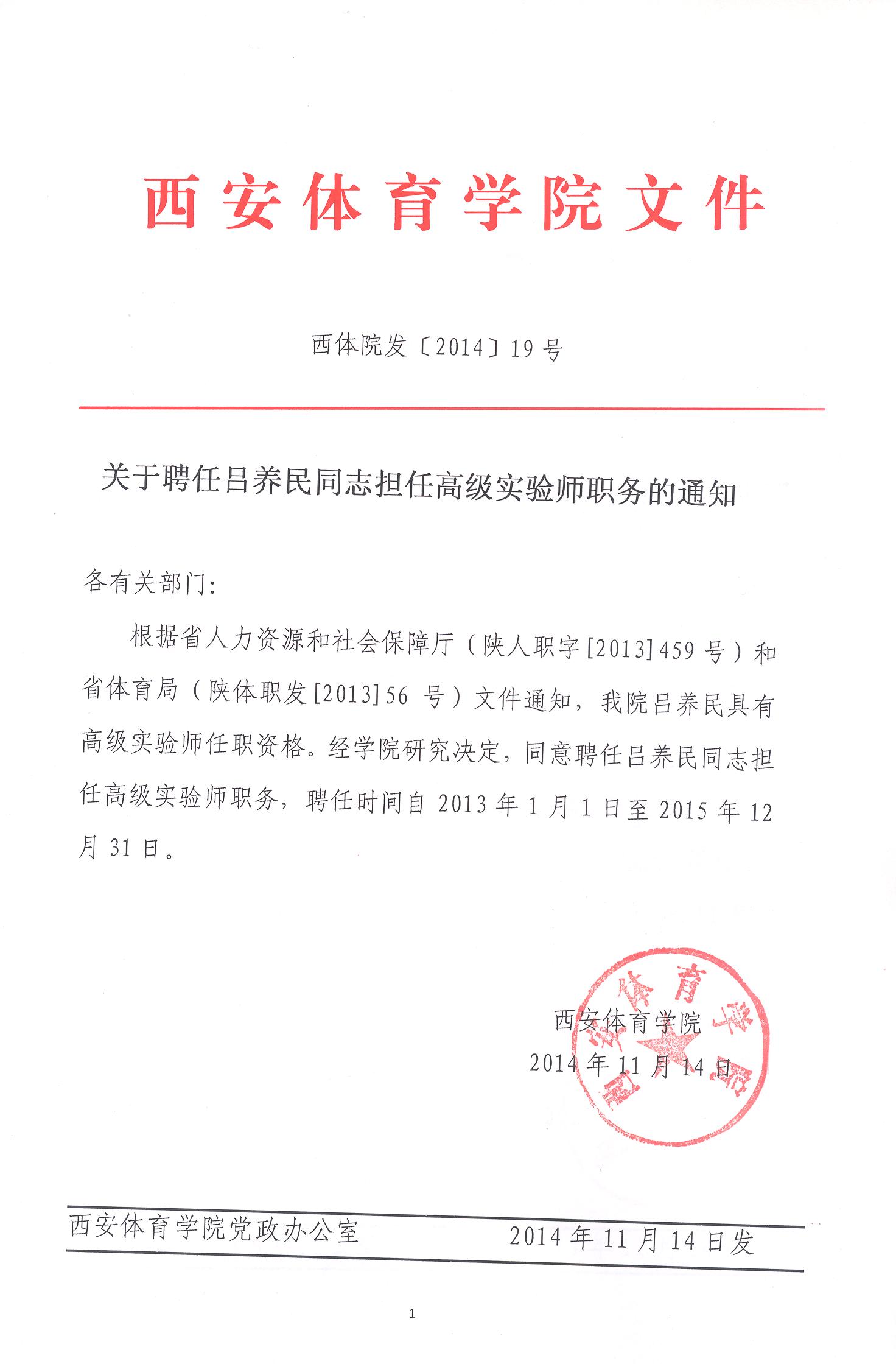 关于聘任吕养民同志担任高级实验师职务的通知-久久不卡区,人事处